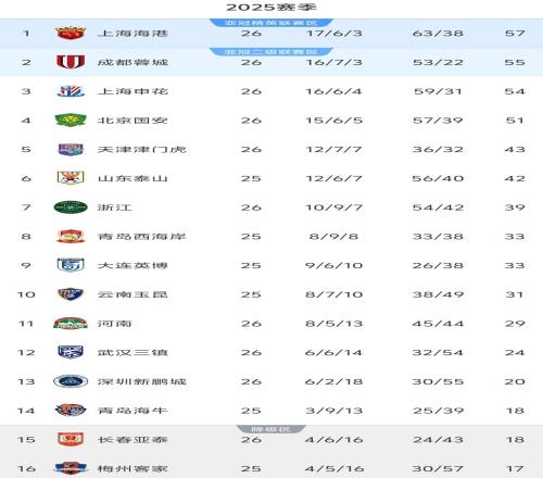 中超26轮积分榜:争冠保级白热化,前3后4均差3分,榜首再度易主